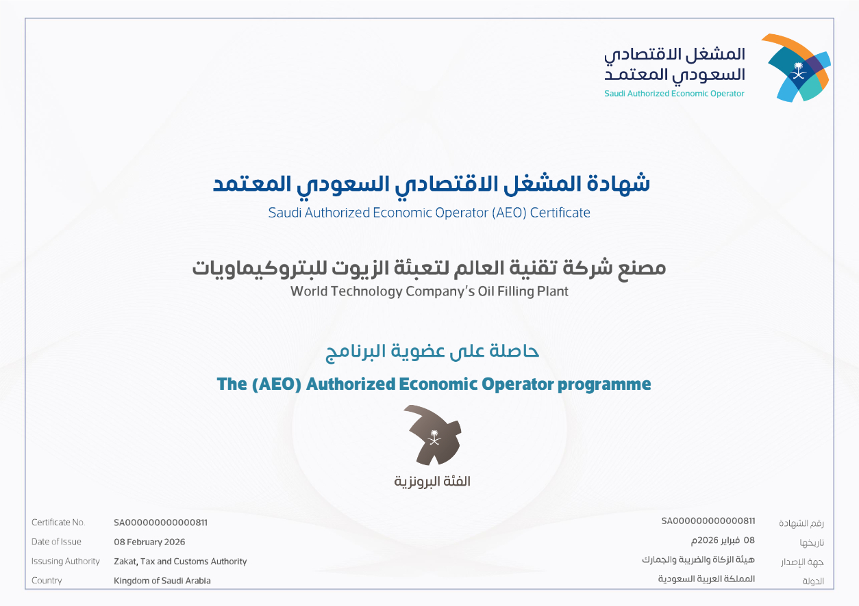 تم تقييم نظام إدارة الجودة في مصنع شركة وورلد أويل تكنولوجي ووجد مطابقًا لمتطلبات المواصفة القياسية الدولية ISO 9001:2015.